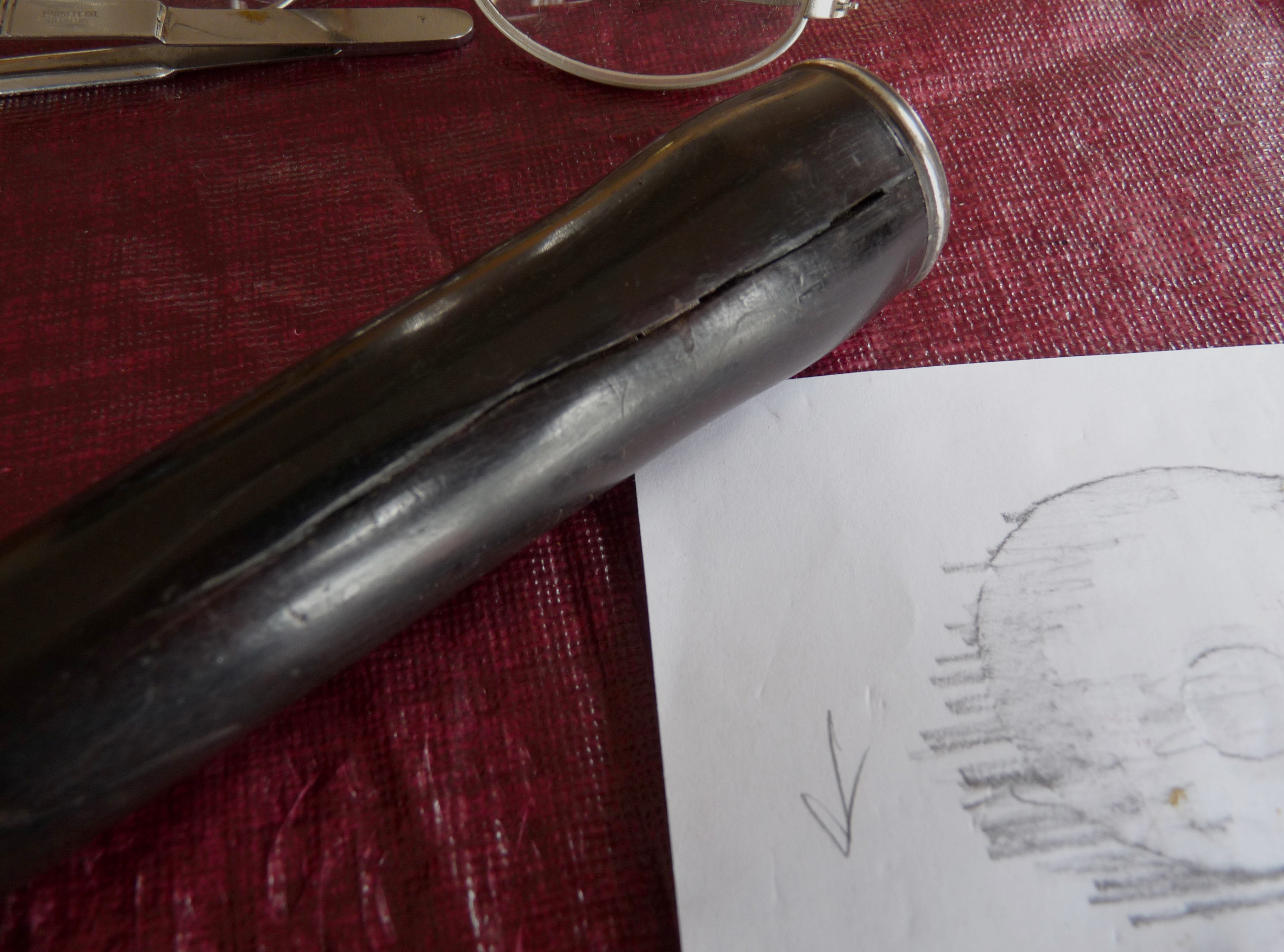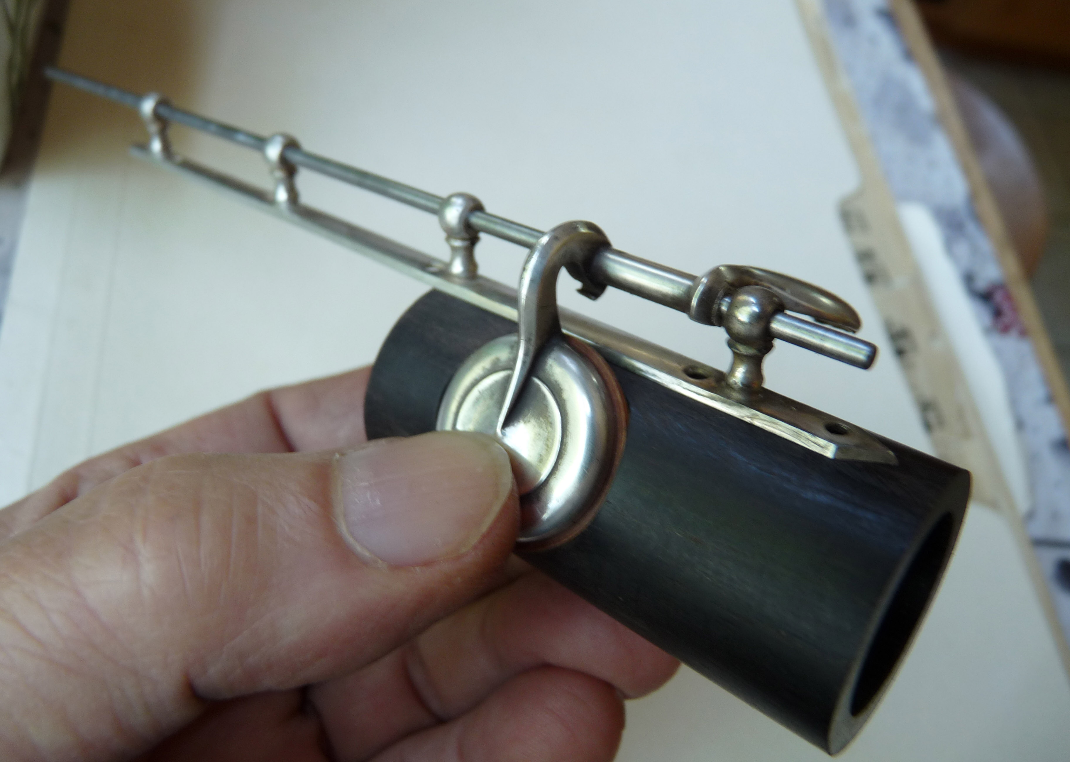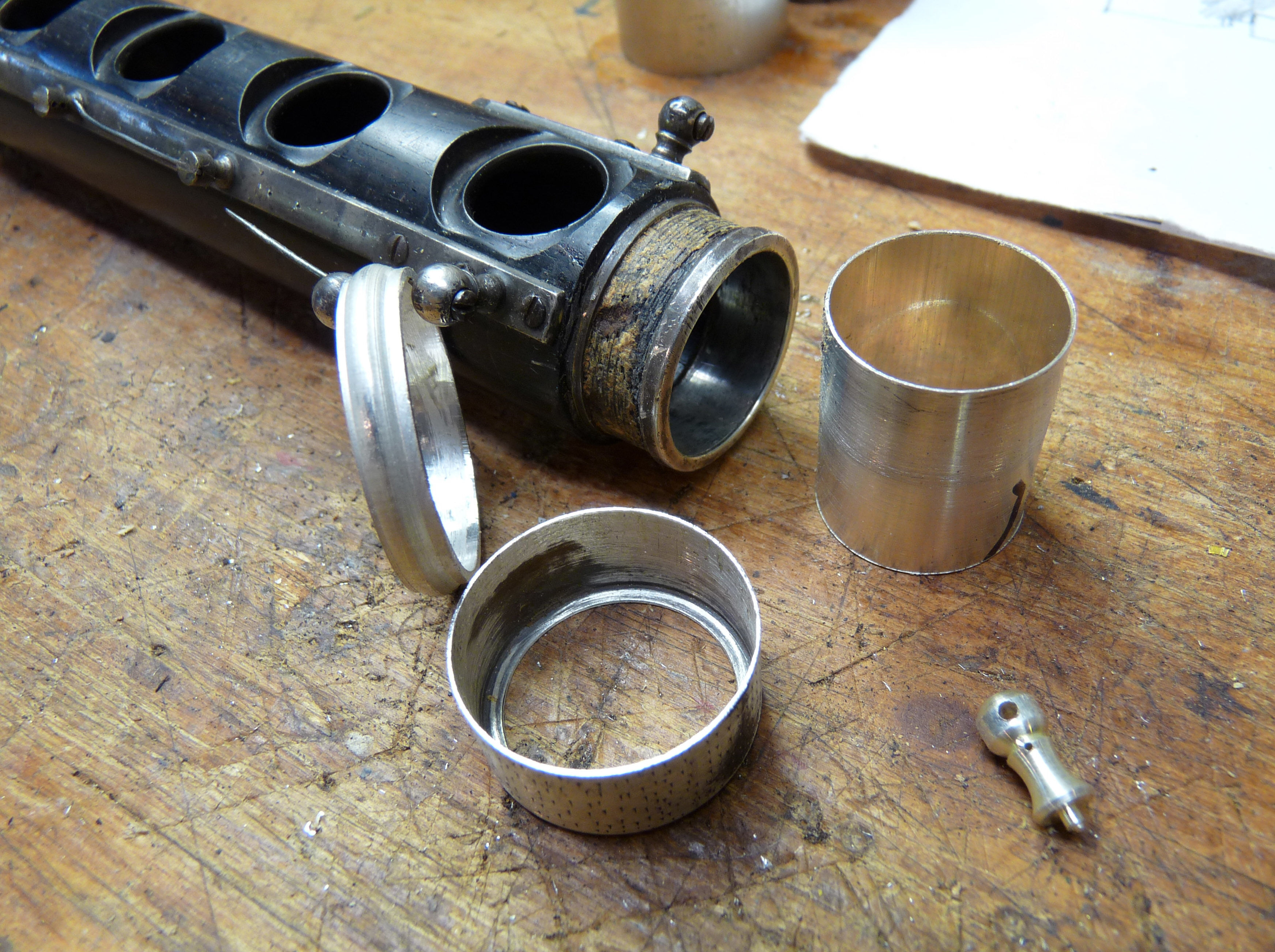 The socket hardware comprised a socket sleeve, an inner silver tube, a ring and a threaded post. The assembly needed a perfect fit within the footjoint, too tight risked cracking the wood, while too loose risked it being pulled out. The alignment and height of the post had to be worked out after the rib was installed. Multi-sessions of test-fitting were common practice.