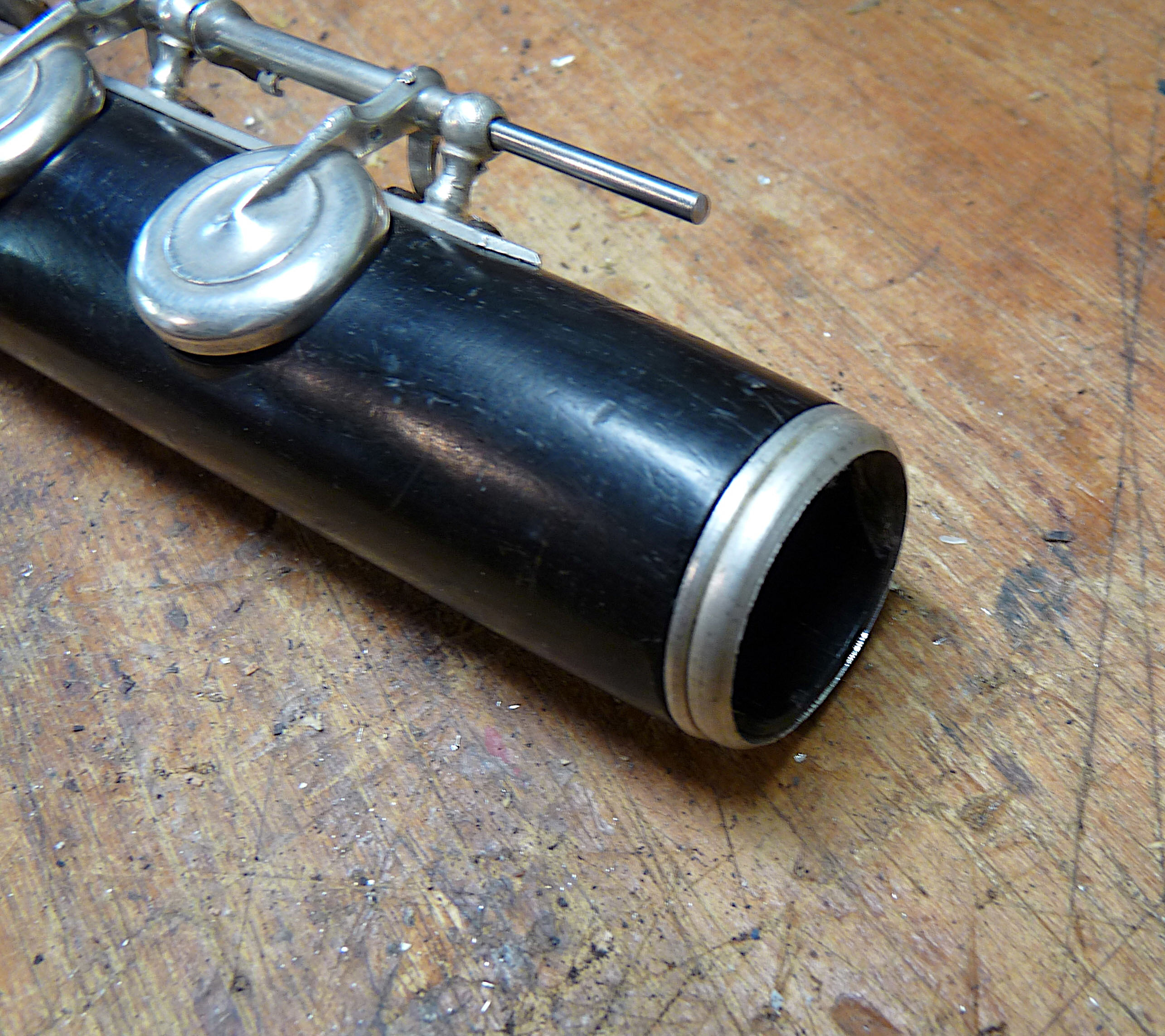 The headjoint had a sizeable crack that had been poorly repaired. It was also missing the lipplate, a ring, the inner silver tube, as well as the crown and cork assembly hardware. I measured the taper, and it was within specifications. The wood had shrunk, but the crack had widened the bore somewhat in an area where the change might be more forgiving. The crucial bore dimension immediately under the embouchure hole was correct. There was no telling how the headjoint would fair on the restored body. Any deficiencies might hopefully be remedied by the final embouchure hole cut.