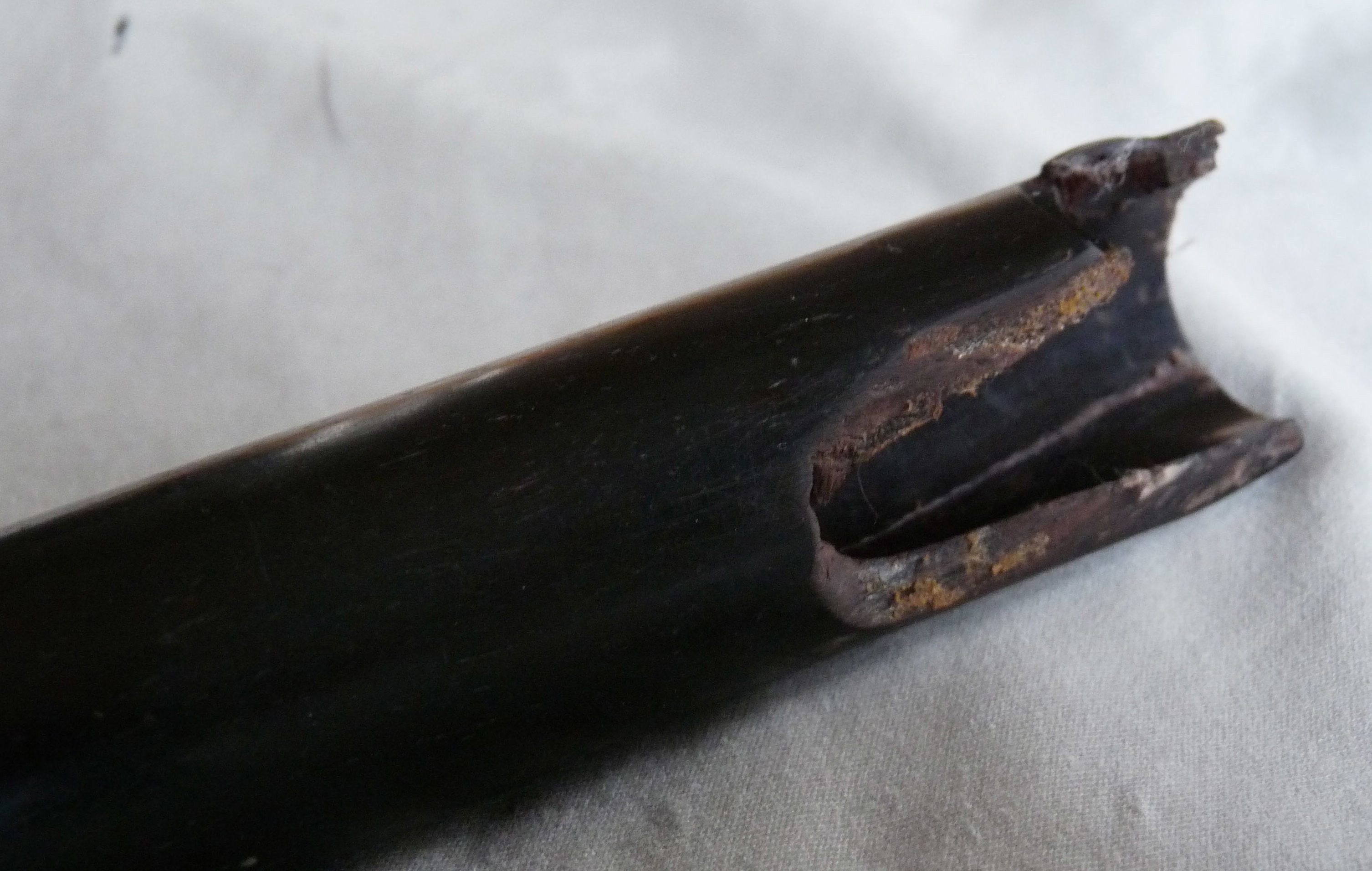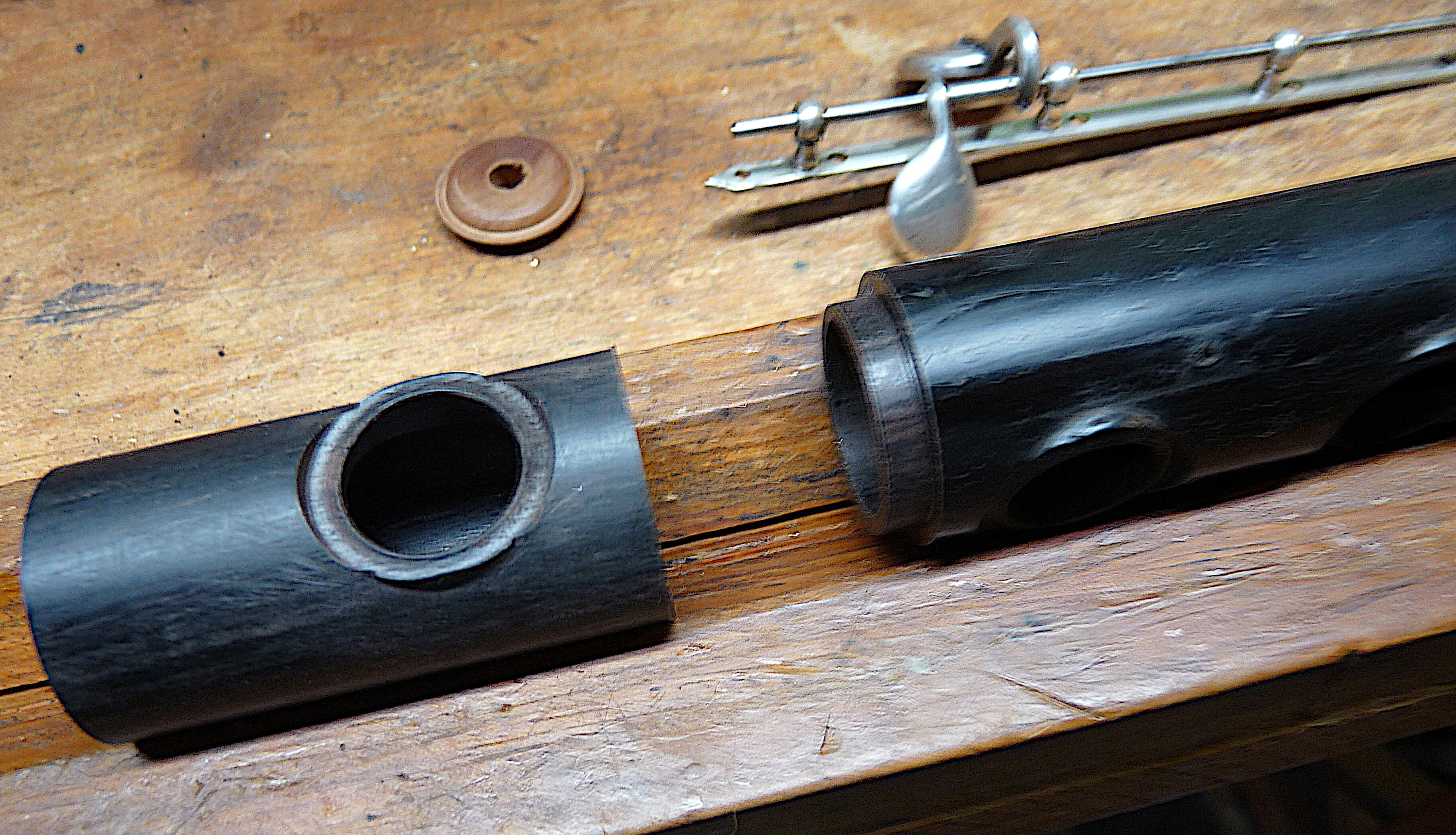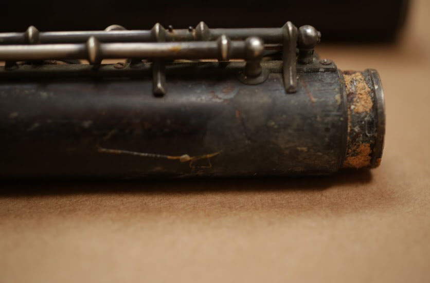 To start, I decided to tackle the seemingly impossible task: the footjoint. It was missing quite a bit of wood, extending past the D# tone hole, the end ring, and the entire metal socket joint that carries the post and another ring. The keys and rib were intact, except for a few missing rib screws and needle springs. The steel was rusted solid inside the mechanical tubing.