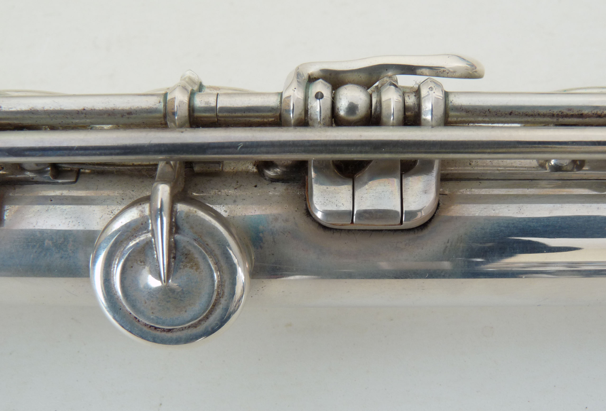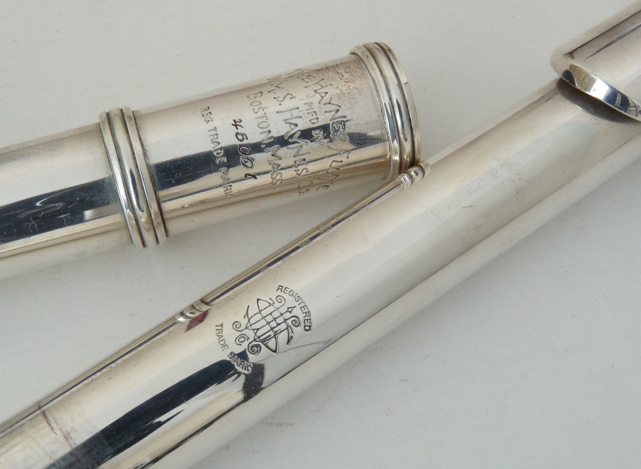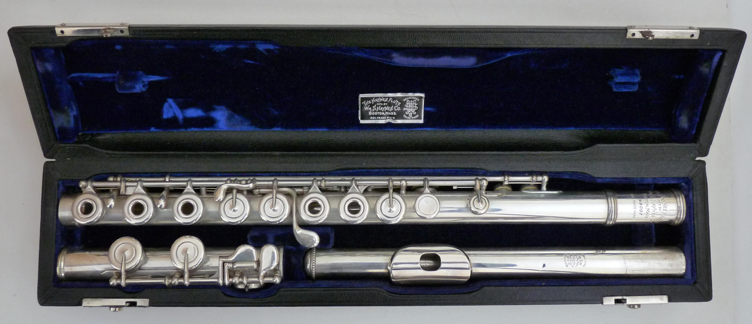 Wm. S. Haynes Flute serial #45001, made in 1979. Solid silver, handmade French model, soldered tone holes, open hole, pointed arms, no adjustment screws, inline G, B-foot, Bb shake, .012" tubing, forged keys and touches, gold springs, traditional scale.