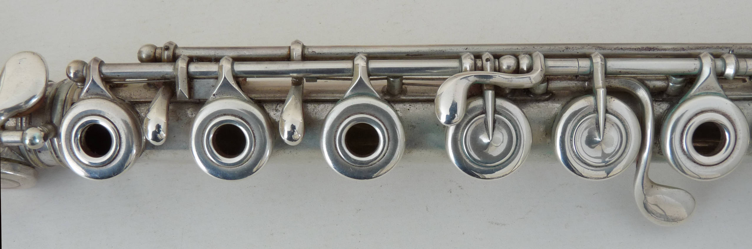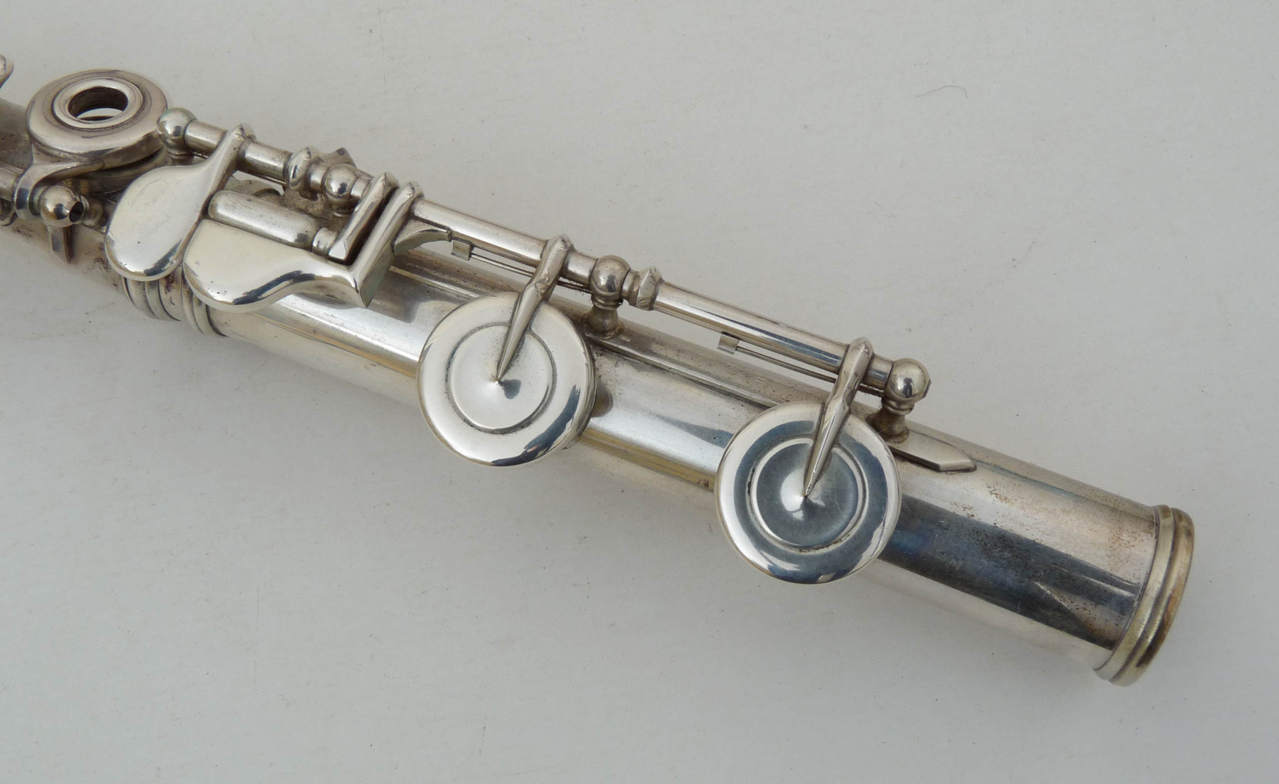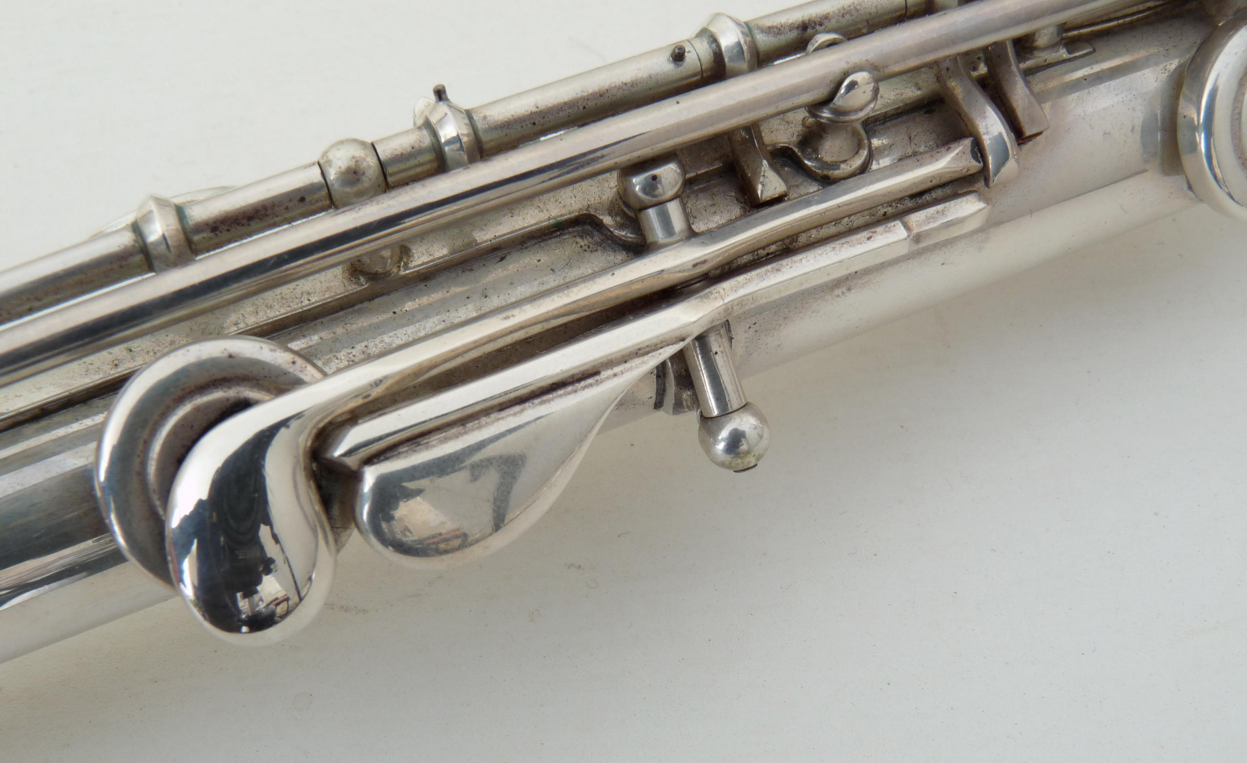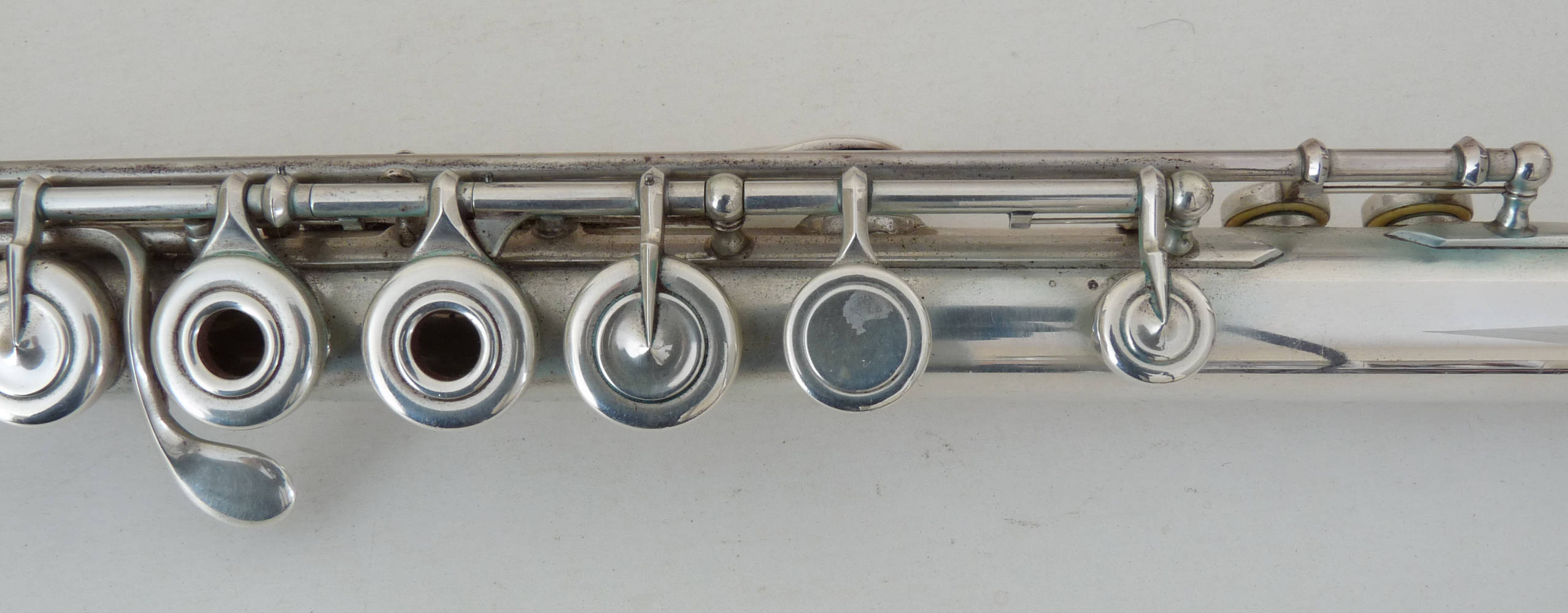 Wm. S. Haynes Flute serial #45001, made in 1979. Solid silver, handmade French model, soldered tone holes, open hole, pointed arms, no adjustment screws, inline G, B-foot, Bb shake, .012" tubing, forged keys and touches, gold springs, traditional scale.