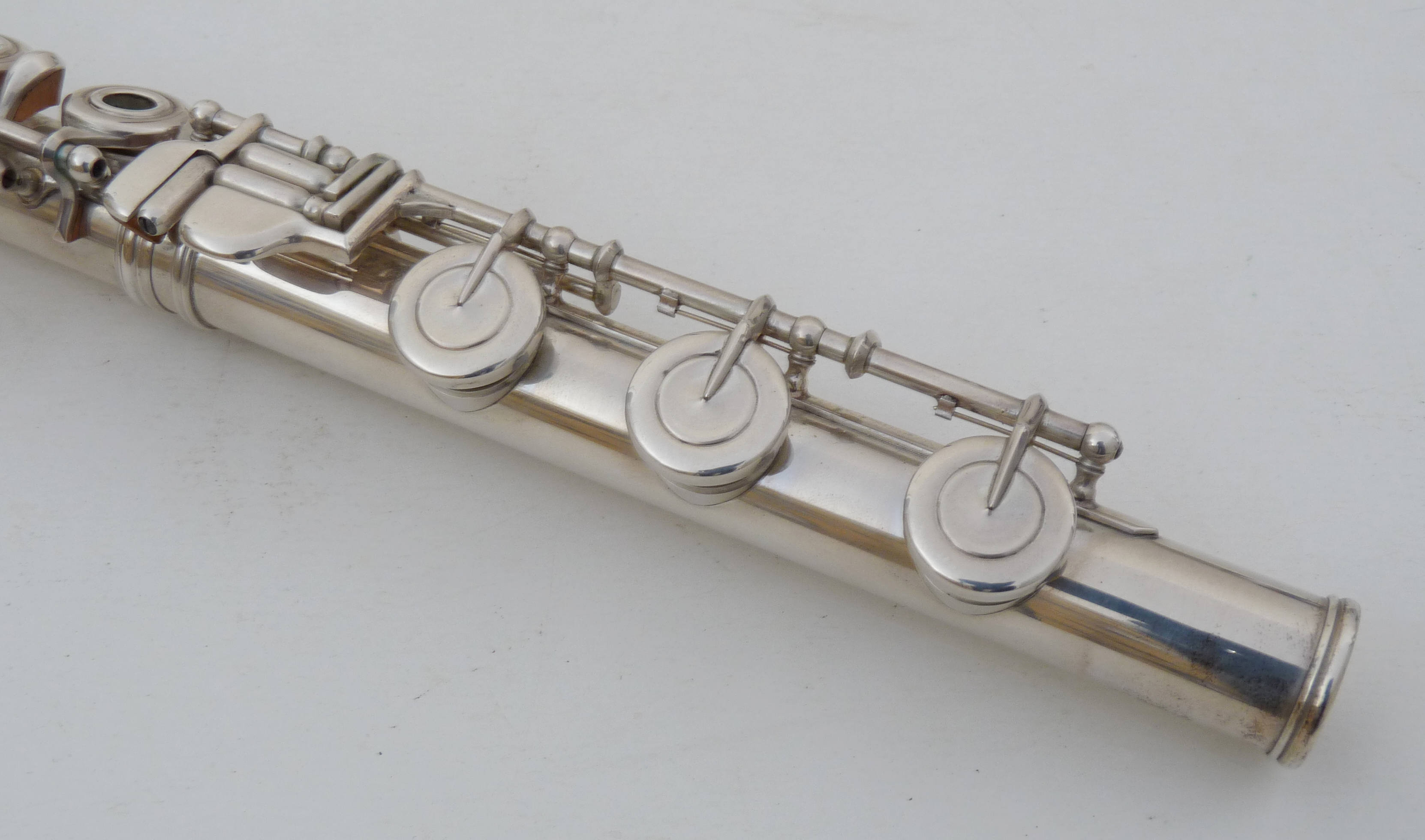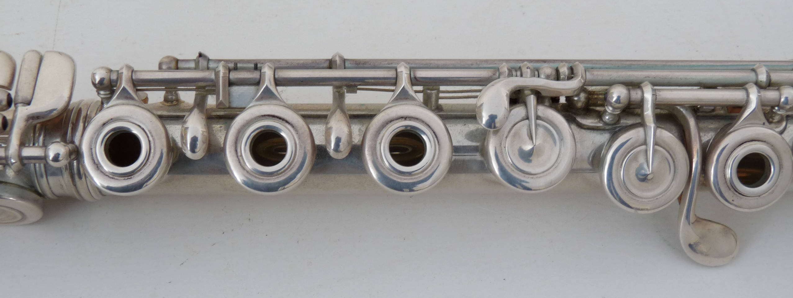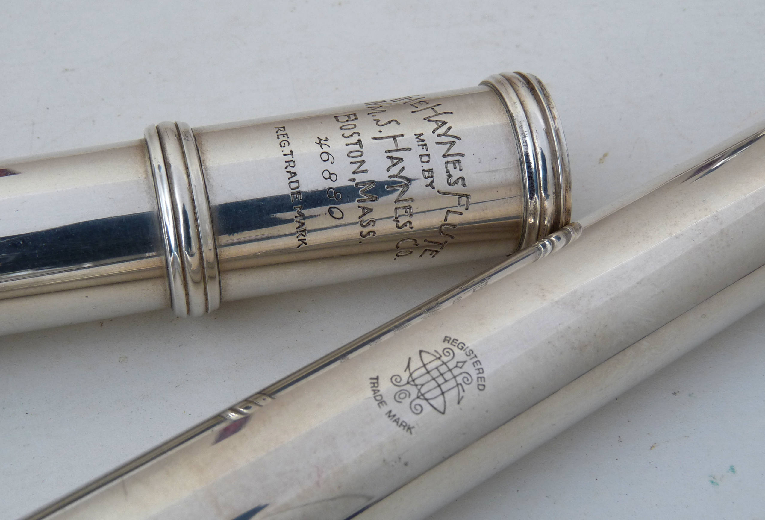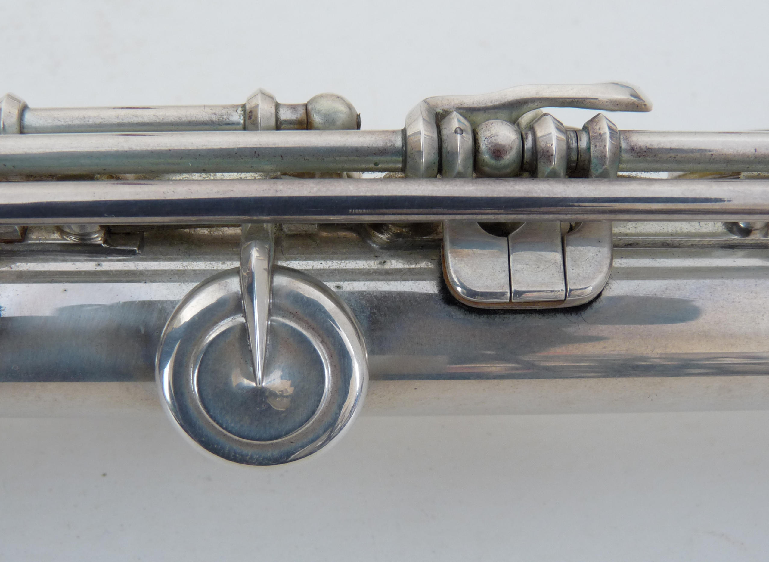 Haynes #46880 was made one year after Lou Deveau introduced his new scale. It was his answer to the modern Cooper scale flutes offered by his competitors Brannen and Powell. Our flute is in fine playing condition, some tarnish. The pads are older but sealing well. The mechanism is in good condition, a sign of a well maintained instrument. The headjoint is well cut, a high wall model drawn on the #9 arbor. It was special ordered by Mary Louis Poor (1923-2021), a well known flutist and teacher. The flute has a very beautiful and yet robust sound. It is easy to articulate fast and cleanly. Strong low register and vibrant sound. It comes in its original case in fair condition.