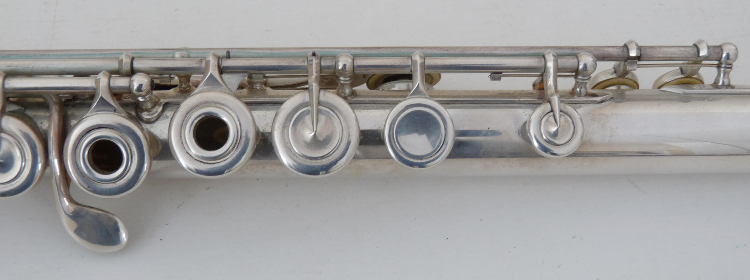 Wm. S. Haynes Flute serial #46880, made in 1982. Solid silver, handmade French model, soldered tone holes, open hole, pointed arms, no adjustment screws, offset G, Bb shake, D# roller, B-foot, .013" tubing, forged keys and touches, gold springs, felt pads, Deveau scale.