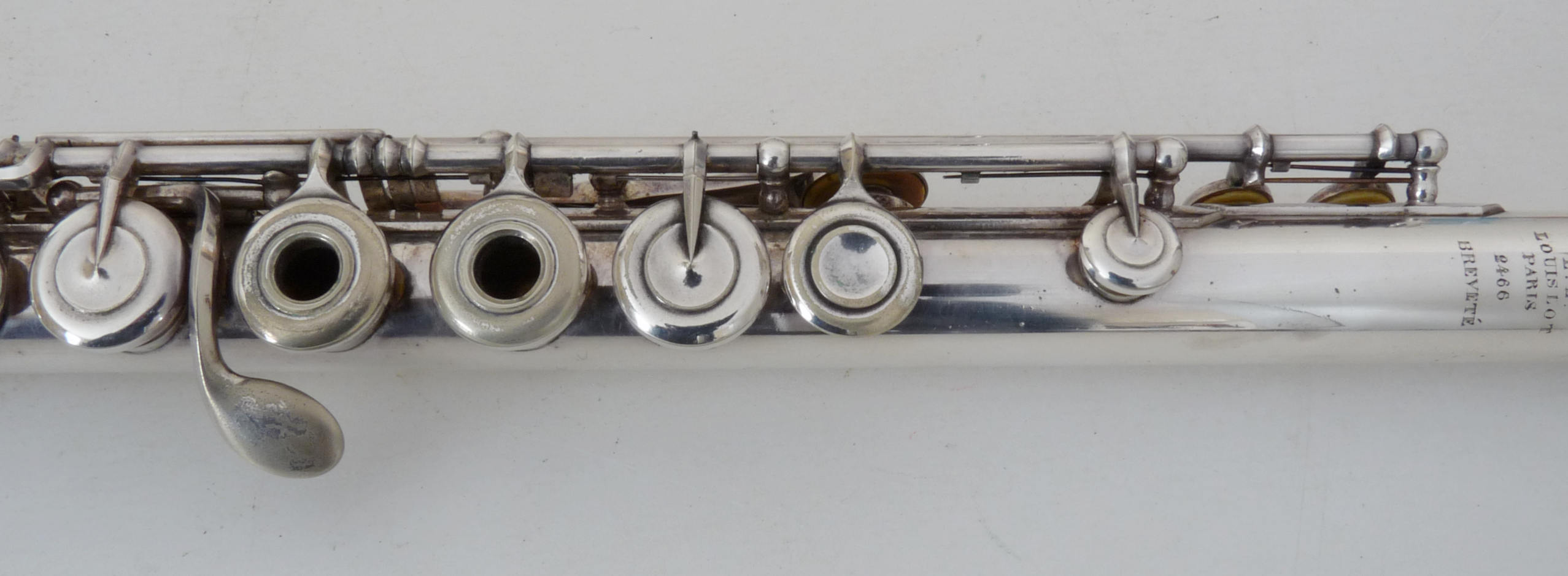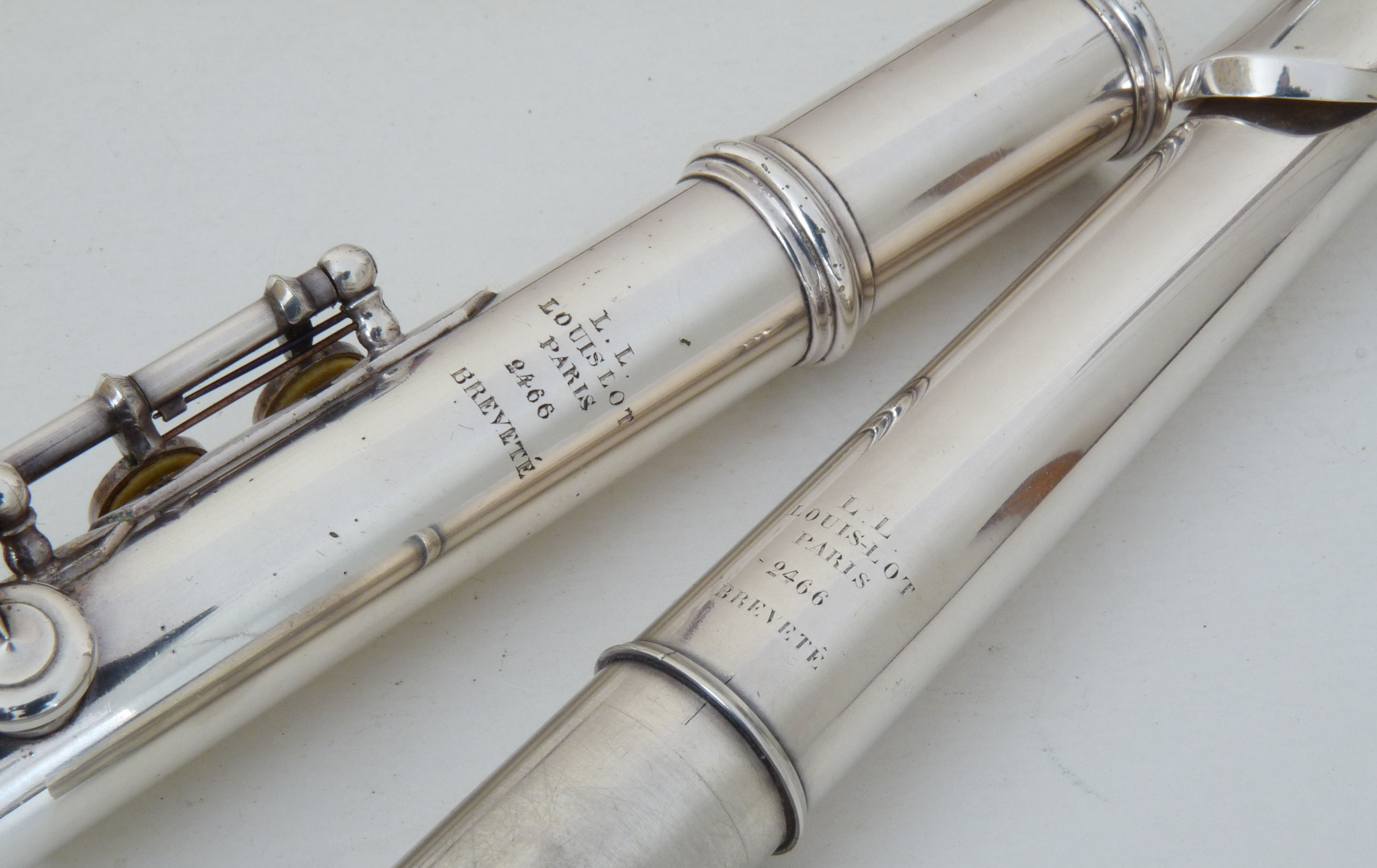 Louis Lot, #2466 was made in 1878 during the second year of Villette’s ownership of the Louis Lot workshop. The flute body is silver plated and the headjoint is solid silver, both have matching serial numbers. It was unusual that Villette paired a silver headjoint with a “tin” body. Tin Louis Lot flutes often have silver lipplates - a practice that was not commonly shared by his contemporaries. Louis Lot must prefer the warmer sound of a silver blowing edge and formulated this combination. An entire silver headjoint would further the cause as demonstrated by the full tone of Lot #2466.