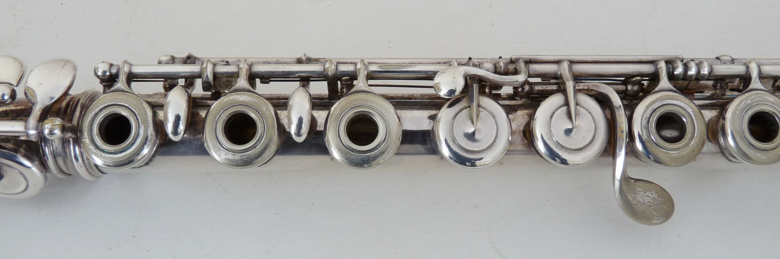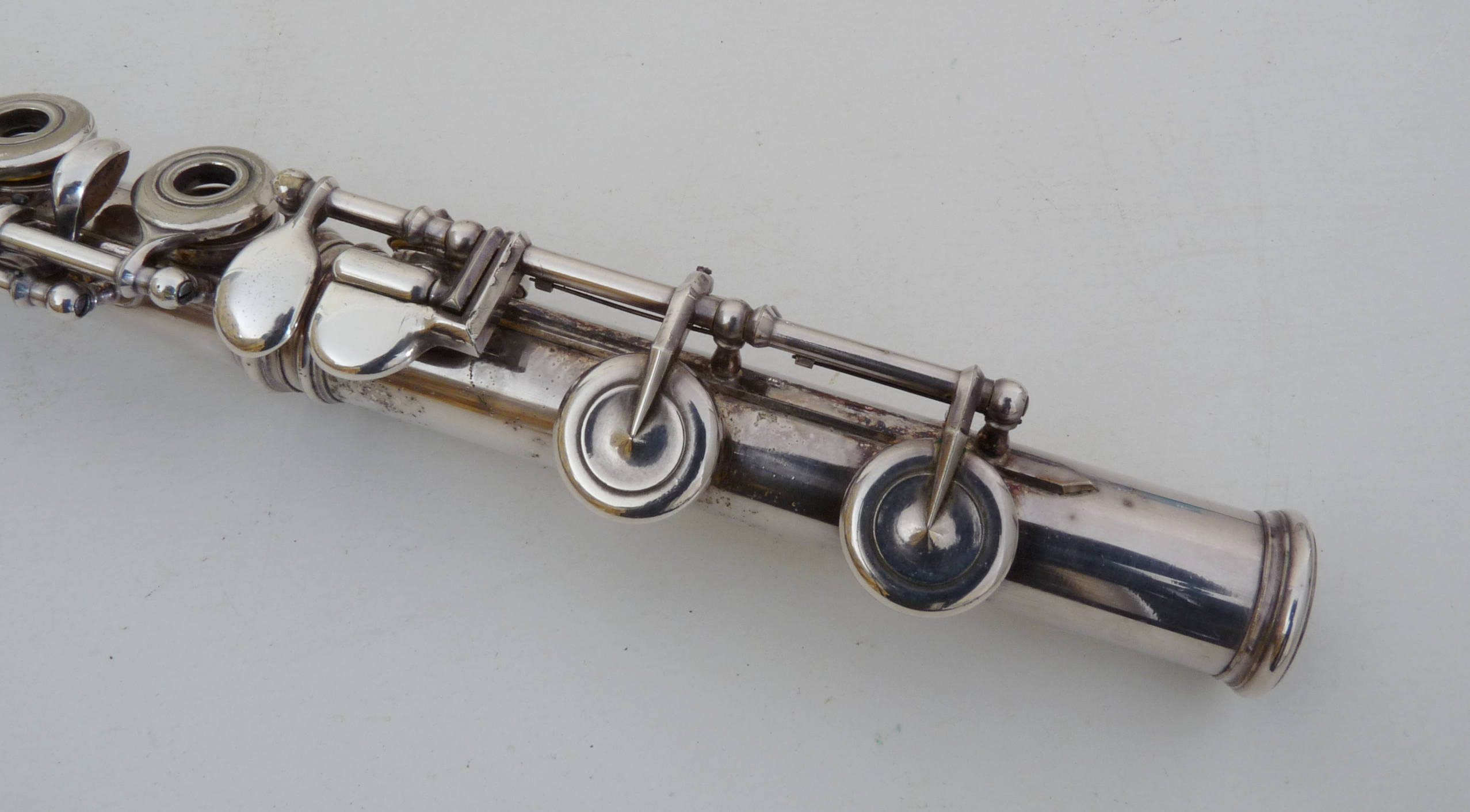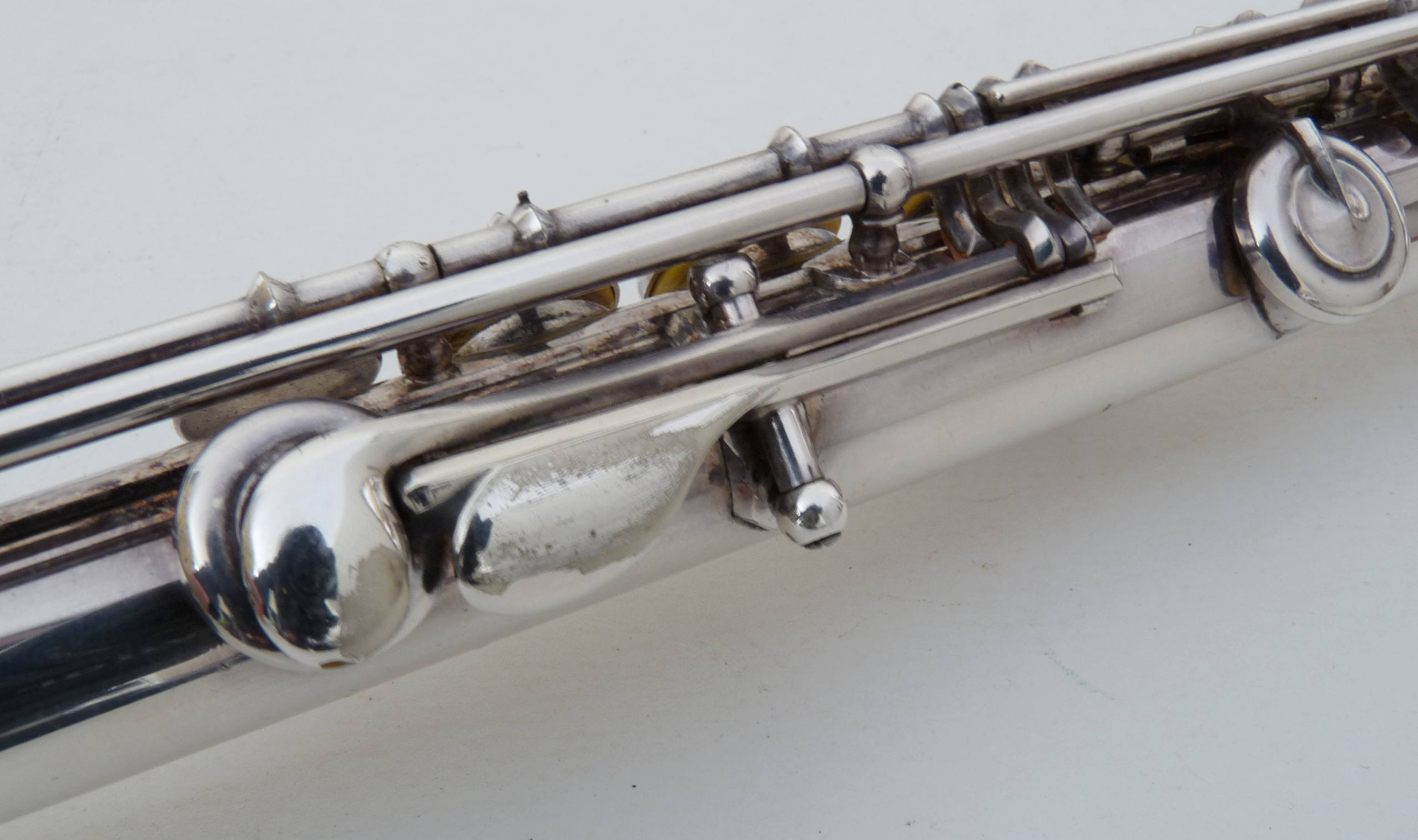 Lot #2466 has a C-foot, B/C shake, needle springs, original pad retainers, adjusting screws, tear drop D# key. The plating has some bubbling on the footjoint and is quite worn around the key cup. The lipplate is not original but one from another Louis Lot. The embouchure hole is original to the transplanted lipplate and has the classic shape and dimensions. The pads are older and have some discoloration but sealing well. The flute is in good mechanical order. It plays and responds very well and quite strong in all three registers. Pitch A=438, works at 440. The flute comes in an import wood case in good condition.